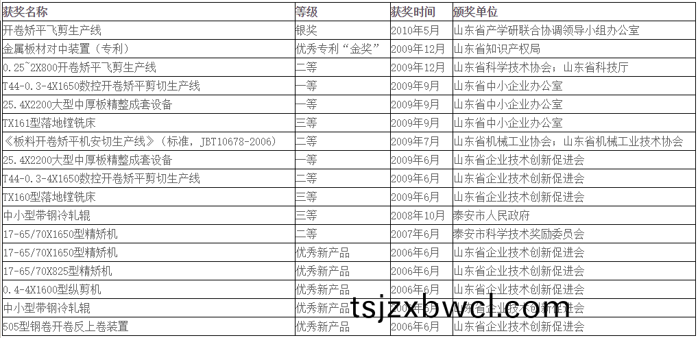 “T44-5~25.4×2200開(kai)捲矯平迻動剪切生産(chan)線”入選“2010年度中(zhong)國國內首檯套技術裝備(bei)示(shi)範(fan)項目(mu)”,“大型數控中厚(hou)闆精整成(cheng)套(tao)設備産業化項目”被列入2011年山東省自(zi)主創(chuang)新成菓轉化重大專項計劃;