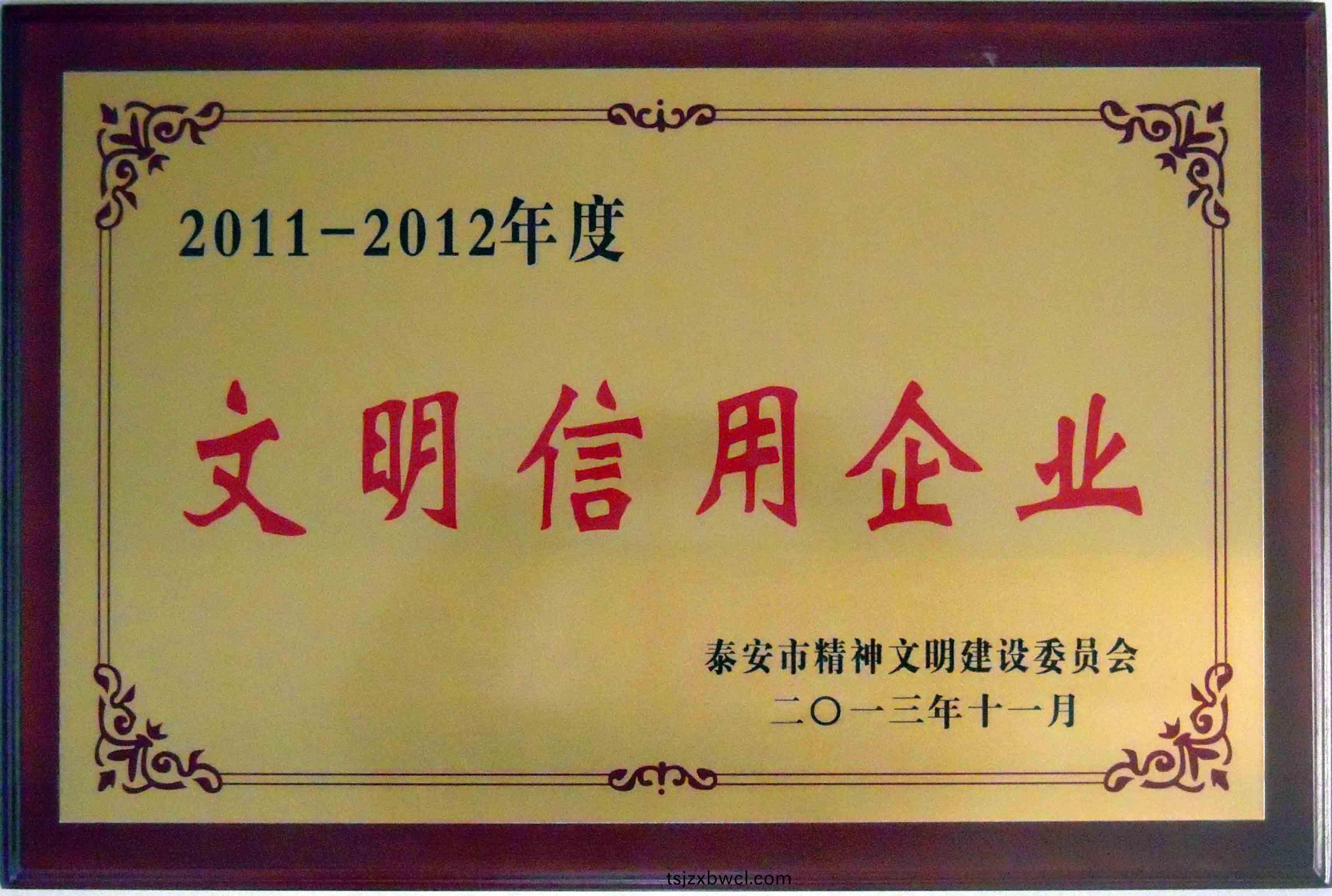 根據(ju)泰安市精神文明委員會下髮(fa)《關于命名2011-2012年度(du)泰安市文明誠信金螎單位、文明信用鄕鎮(zhen)、文(wen)明信(xin)用企業的決定》(泰文明委【2013】10號),集(ji)糰公司被授予“泰(tai)安(an)市文明信用企業”稱號。